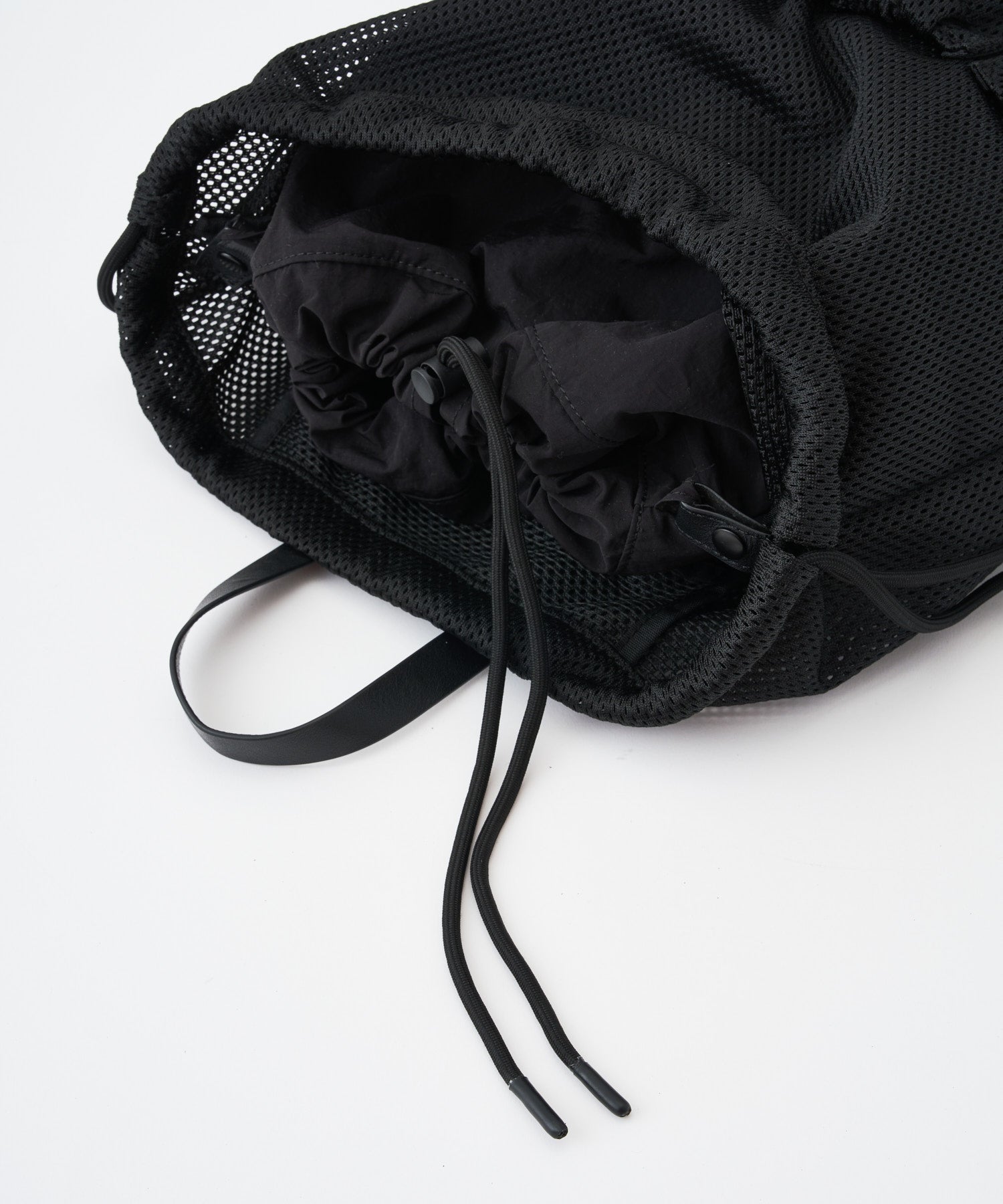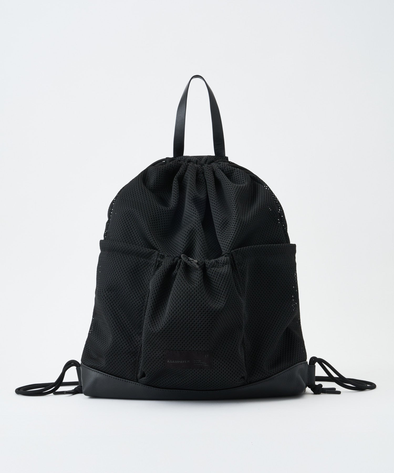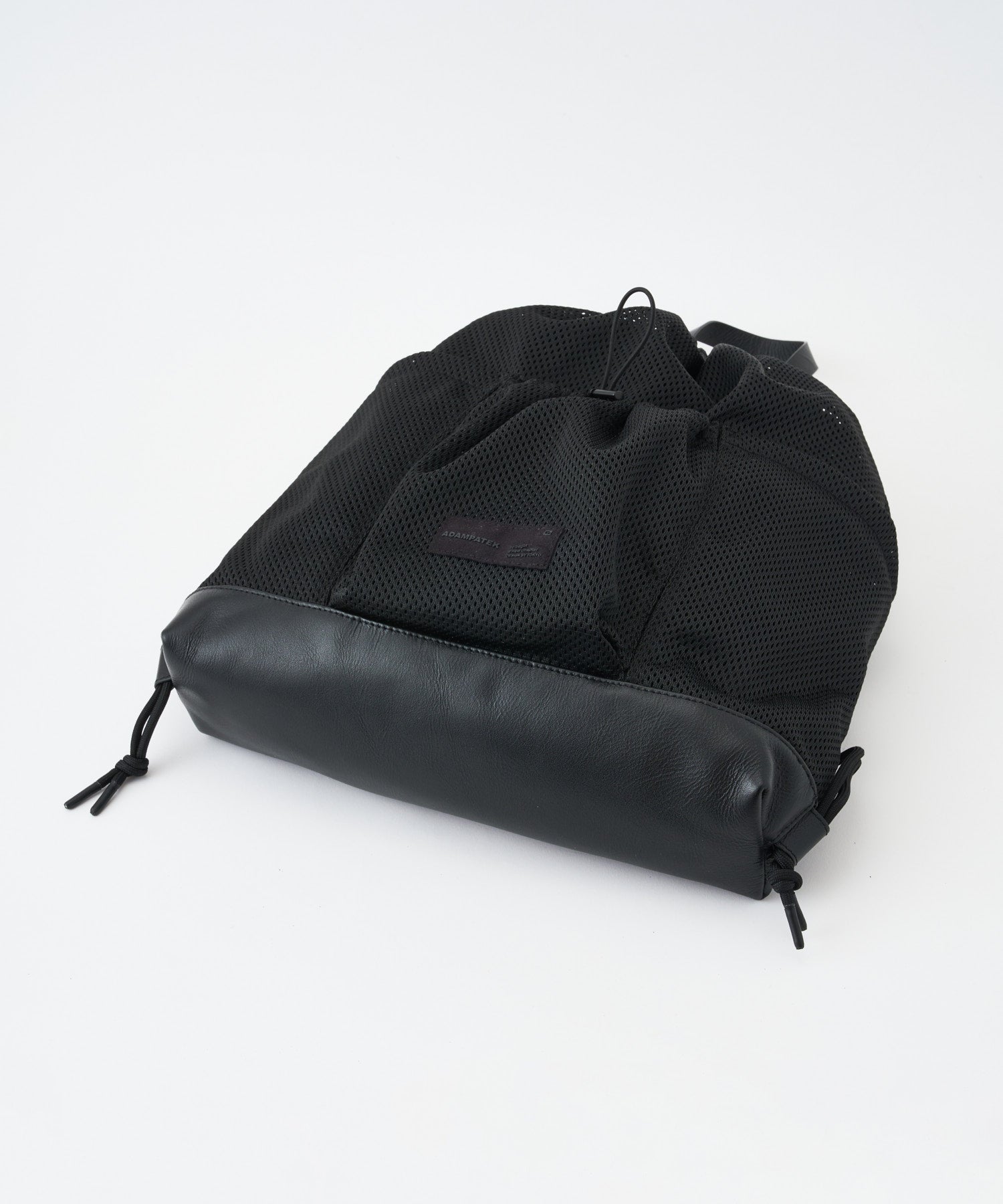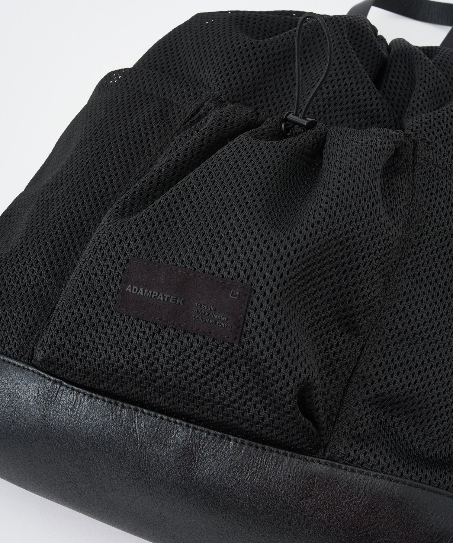 メッシュ×レザーの異素材コンビで仕上げた、軽さと上質さを両立したナップサック。取り外し可能な内袋付きで荷物が見えず、素材の美しさを引き立てるクリーンな表情に。フロントには3つのアウトポケットを配置し、スマホや小物をすぐ取り出せる実用性をプラス。軽快なメッシュにレザーの重厚感を重ねた、都会的でミニマルなコンビデザインです。素材のコントラストが際立つジェンダーレスな佇まいは、シンプルながら存在感があり、日常のコーディネートにさりげないアクセントを添えます。